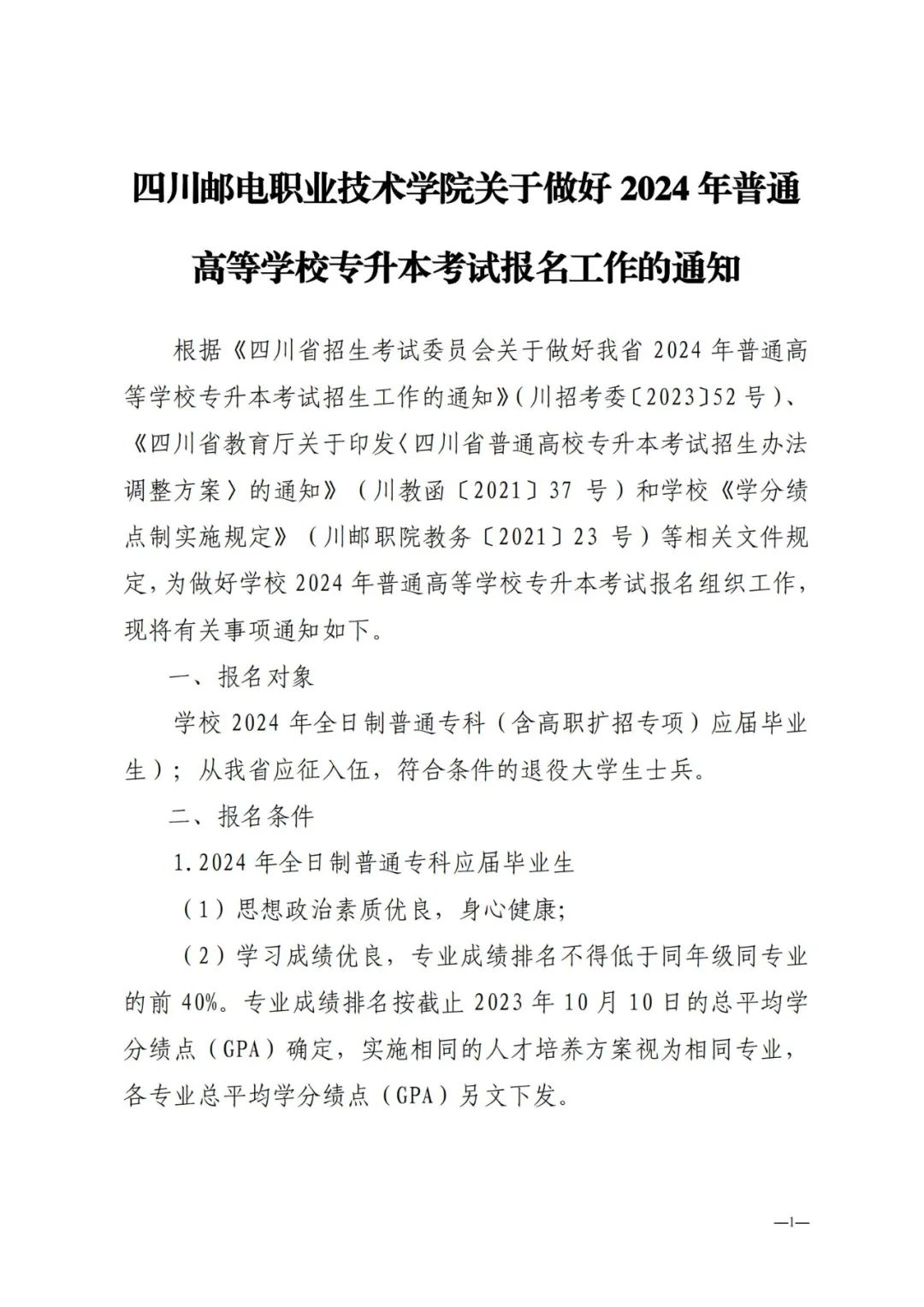 四川邮电职业技术学院关于做好2024年普通高等学校专升本考试报名工作的通知