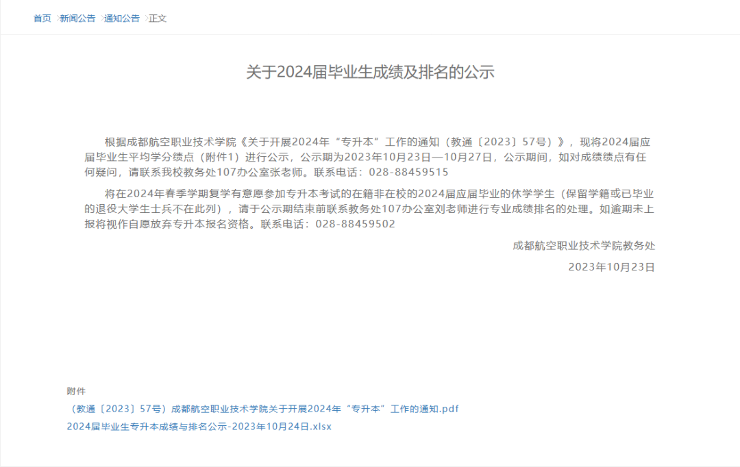 成都航空职业技术学院公示2024届毕业生成绩及排名: